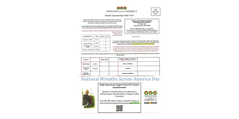 Help our local American Legion Post 621 Honor Local Heroes! Sponsor a Wreath to be placed on a veteran's grave this December at the Squaw Valley Cemetery